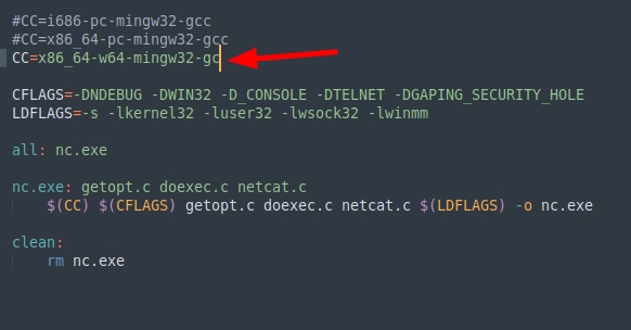 Edit make file and add CC=x86_64-w64-mingw32-gcc